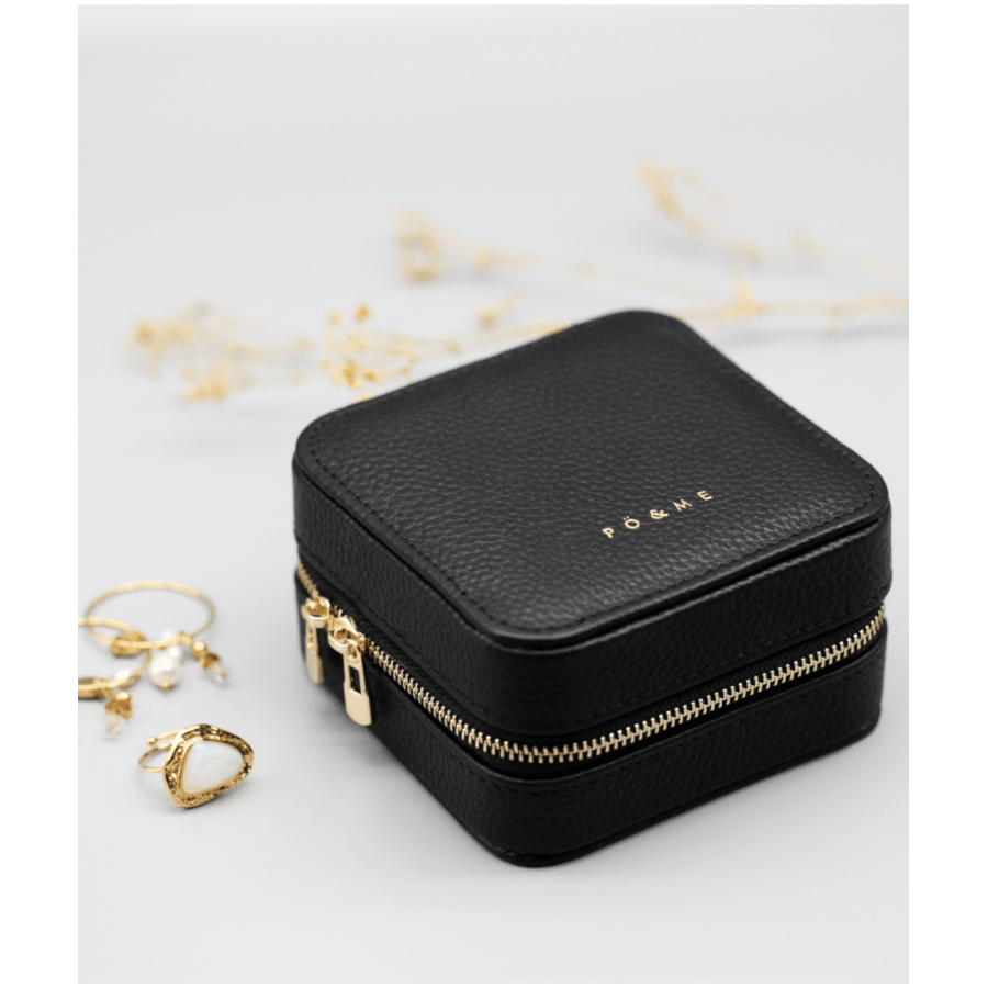 Boîte à Bijoux Carreau - Grainé Cette petite boîte à bijoux de format carré, au cuir lisse ou grainé, dispose pour vous un doux écrin organisé en 4 compartiments à essentiel et 5 vagues de velours plié pour bagues et anneaux. Le couvercle lui-même, au toucher moelleux, accueille vos parures d'oreilles préférées (3 présentoirs) et une poche élastique pour chaînes, bracelets, fibules, épingles…